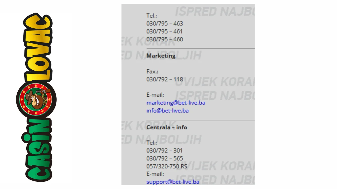 Bet-live korisničkoj podršci možeš se obratiti telefonski na sljedeće brojeve: 030/795 – 463, 030/795 – 461, 030/795 – 460.