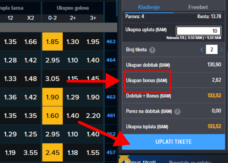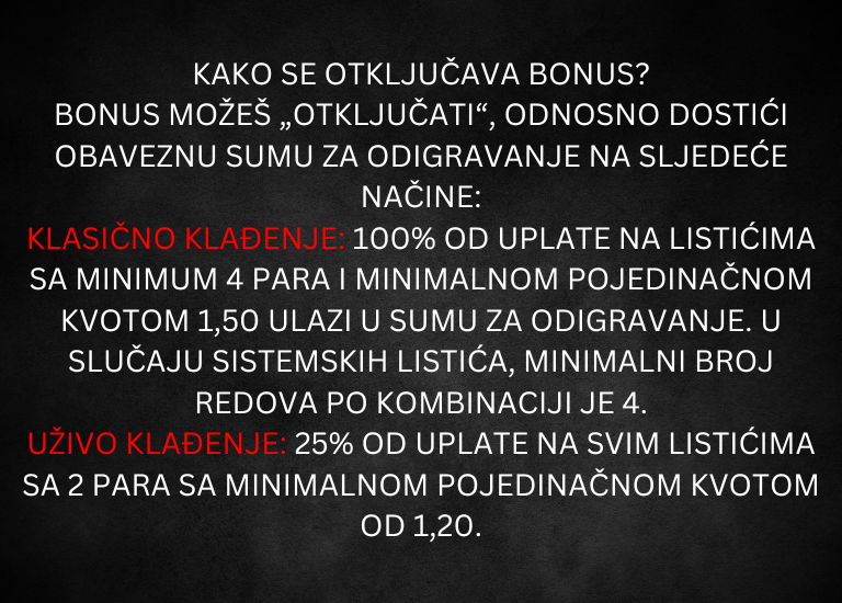 Obrtni uslovi – Ovo je broj puta koji moraš uložiti iznos bonusa (ili bonus + depozit) prije nego što možeš da povučeš sredstva. Na primjer, bonus od 100 KM sa obrtom 20x znači da moraš uložiti ukupno 2000 KM prije povlačenja.