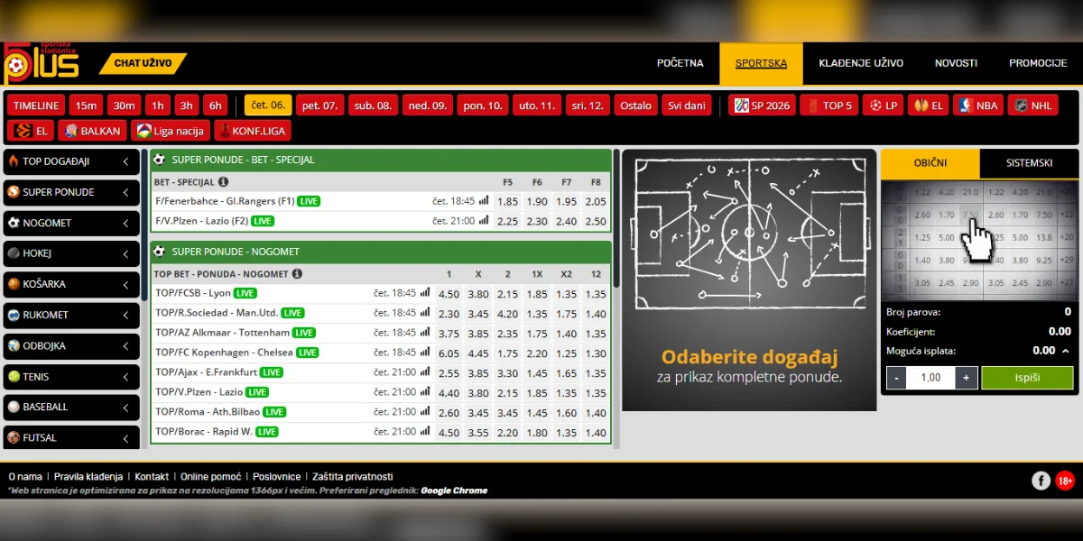 Uz standardnu ponudu za sportsko klađenje i LIVE klađenje, 5Plus kladionica omogućava igračima i praćenje najnovijih dešavanja iz svijeta sporta. U rubrici “Novosti”, možeš pronaći informacije o aktuelnim događajima u fudbalu, košarci, rukometu, tenisu i drugim sportovima.
