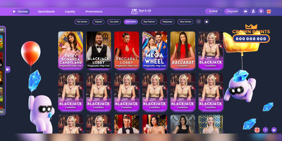 Live dealer lobi na Bet It All Casinu je pravi spektakl, sa igrama od najpoznatijih provajdera poput Evolution Gaming, NetEnt i Pragmatic Play. Igre se prenose direktno iz profesionalnih kazino studija, a visoko efikasni dileri koordiniraju igru.