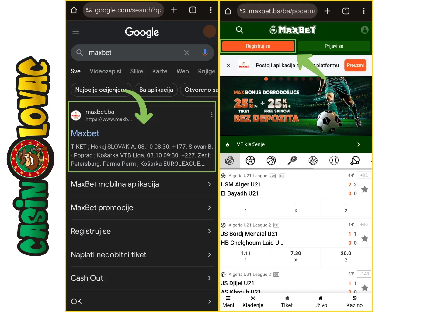 1. Nakon što ste na svom pretraživaču ukucali “Maxbet”, kliknite na njihovu zvaničnu stranicu (prva fotografija). Otvorit će vam se početna stranica Maxbet-a, a u gornjem lijevom uglu se nalazi dugme za registraciju koje trebate kliknuti (druga fotografija).