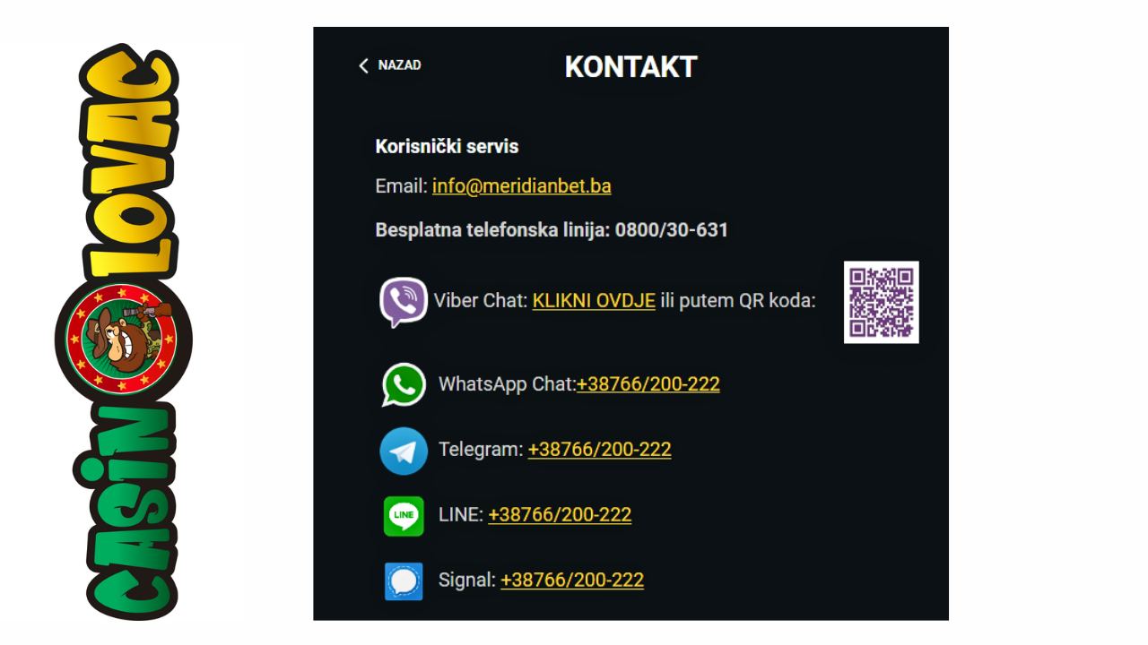 Da, možeš kontaktirati Meridianbet putem WhatsApp-a ili Vibera. Broj za kontakt je: +387 66 610 522.