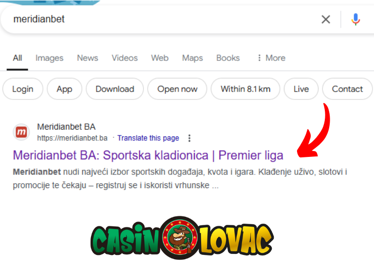 Otvorite svoj pretraživač (Google, Bing ili neki drugi) i ukucajte Meridianbet. Kliknite na prvi link koji vodi na zvaničnu web stranicu Meridianbet-a.