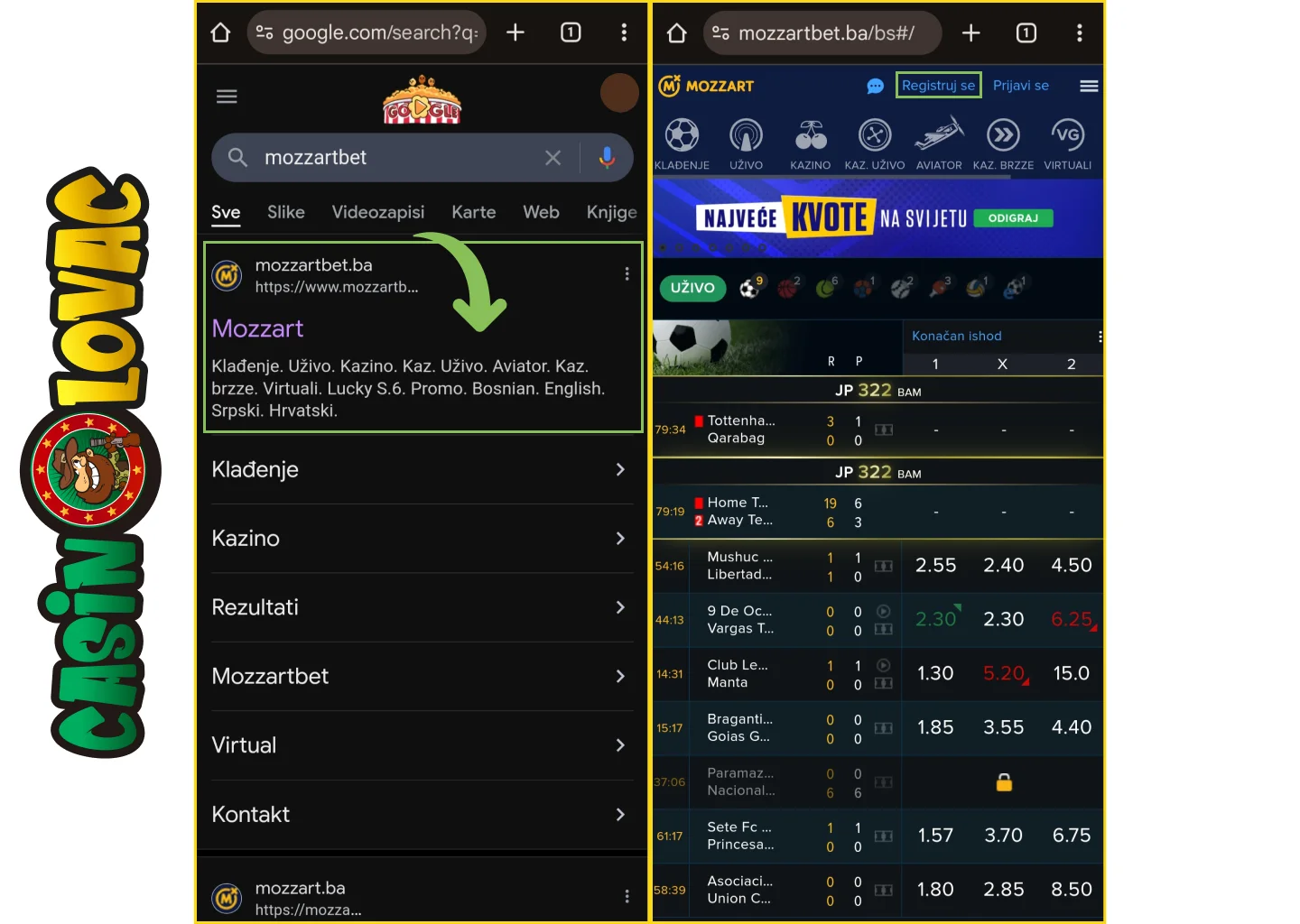 1. Nakon što na svom pretraživaču ukucate Mozzartbet, kliknete na oficijalnu stranicu (prva fotografija), koji vas vodi na početnu stranicu MozzartBet-a. U gornjem desnom uglu se nalazi dugme za registraciju koje trebate kliknuti.