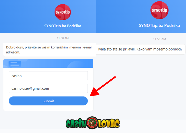 Unesi svoje korisničko ime i email adresu, a zatim klikni na “Submit”. Nakon toga, otvoriće ti se chat prozor gdje možeš direktno opisati svoj problem korisničkoj podršci.