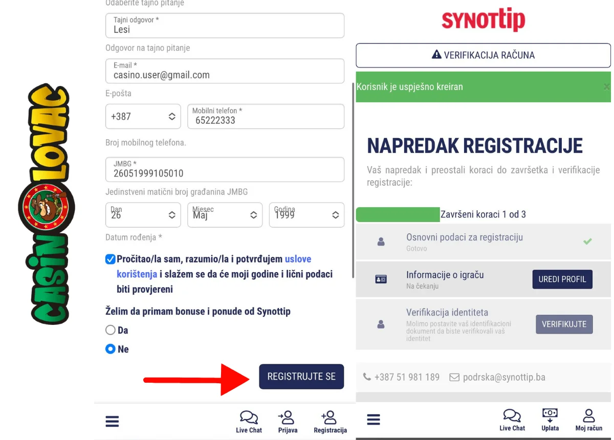 Nakon što si posjetio zvaničnu stranicu Synottip, klikni na dugme Registracija koje se nalazi u donjem desnom uglu ekrana. Zatim unesi osnovne informacije kao što su: